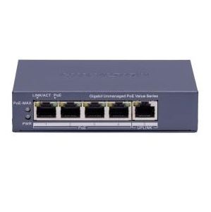 4 puertos PoE Gigabit, 1 puerto de enlace ascendente Gigabit